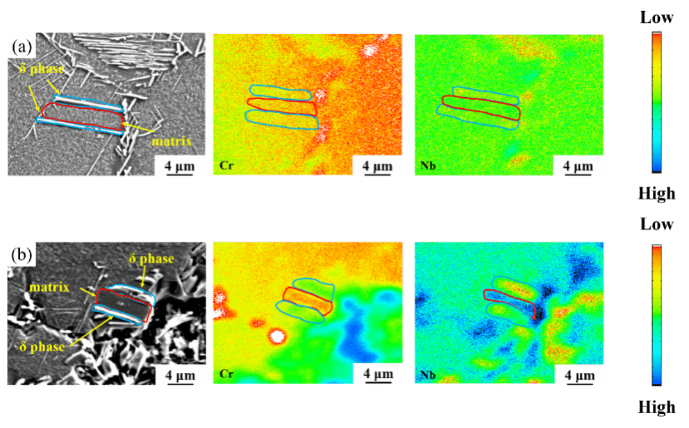 Inconel 625合金中δ相及其邻近区域的EPMA图:(a)未腐蚀区域;(b)腐蚀区域。