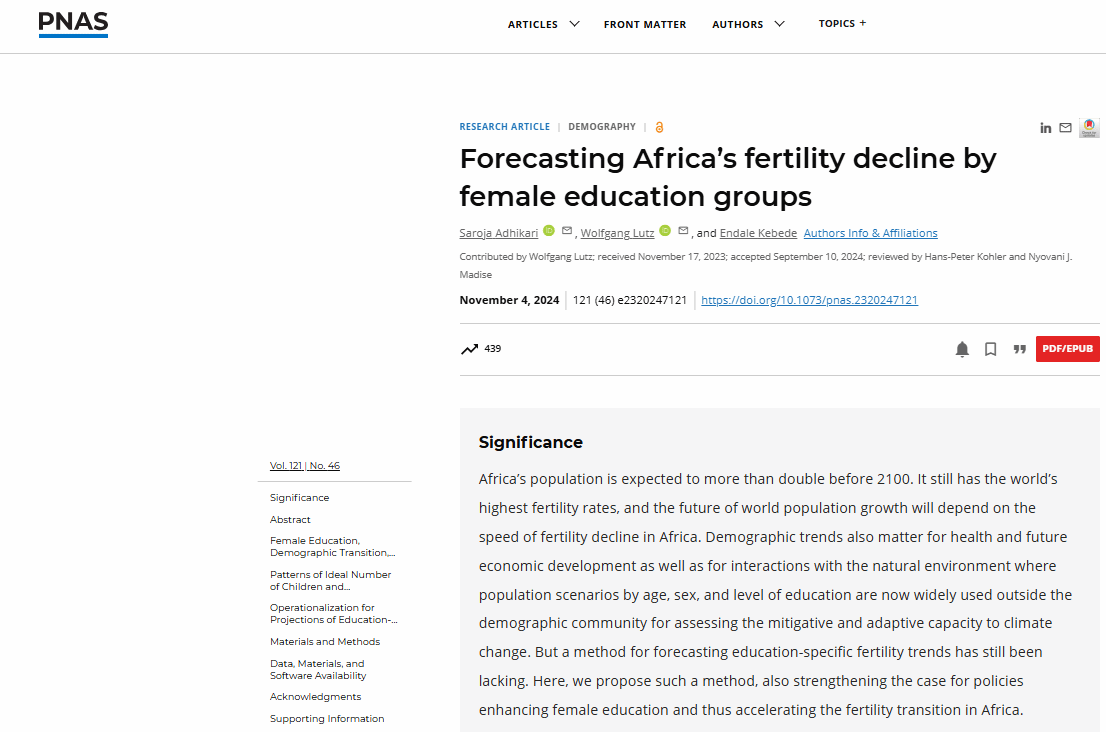 Wolfgang Lutz院士与马克斯普朗克人口研究所(MPIDR)、维特根斯坦人口与全球人力资本中心和维也纳大学合作,提出了一套按教育类别预测生育变动的新方法,采用1986年至2022年在39个撒哈拉以南非洲国家进行的138项人口和健康调查数据,得出妇女高教育程度与低生育水平高度相关的经验值。不仅如此,该研究的创新之处还在于,不仅是女性个人的教育水平重要,而且她们所处环境的平均教育水平也很关键;对于各种教育类别的女性而言,平均教育水平与理想家庭规模和实际生育水平的负相关适用于广泛的地理和时间背景。据此,作者建构了分教育类别预测生育率变动的模型,其预测以女性个人受教育程度和本地区平均教育水平为基础,而不是从主观假设出发,从而为制定人口规划与社会经济发展战略提供了科学依据。