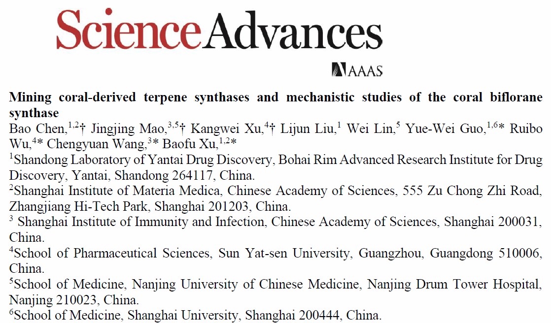 该研究首次完成了对海洋软珊瑚来源的Biflorane二萜的生物合成酶的发现及其合成机制研究,标志着我国在该领域取得重大突破,填补了国内空白,为海洋珊瑚萜类化合物的生物合成研究开辟了新的方向,为解决多年以来的海洋珊瑚活性化合物的来源问题提供了新的解决方案,即通过生物合成研究实现海洋珊瑚活性化合物的异源高效生产。