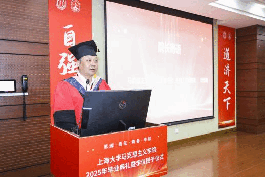 学院党委副书记、主持工作副院长叶海涛教授幽默风趣且饱含深情地为2025届毕业生寄语。当前学院开启高质量发展的新篇章,构建起全链条、多层次人才培养体系,青年学子贡献智慧和责任,必定学有所获、学有所成。他呼吁广大毕业学子勿忘继续“读书”。多读书是同学们拓宽视野、丰富思想的关键途径,无论是对于学术研究的深入探索,还是投身社会实践的广泛参与,都有着不可估量的巨大收益。同时,他也着重强调了提升情商的重要性。当今复杂多变的社会环境中,情商是同学们实现高效沟通、紧密协作及妥善处理人际关系的必备素养。最后再次祝福每一位马院学子心中有爱,眼里有光,行中有善,脚下有路,前程似锦!